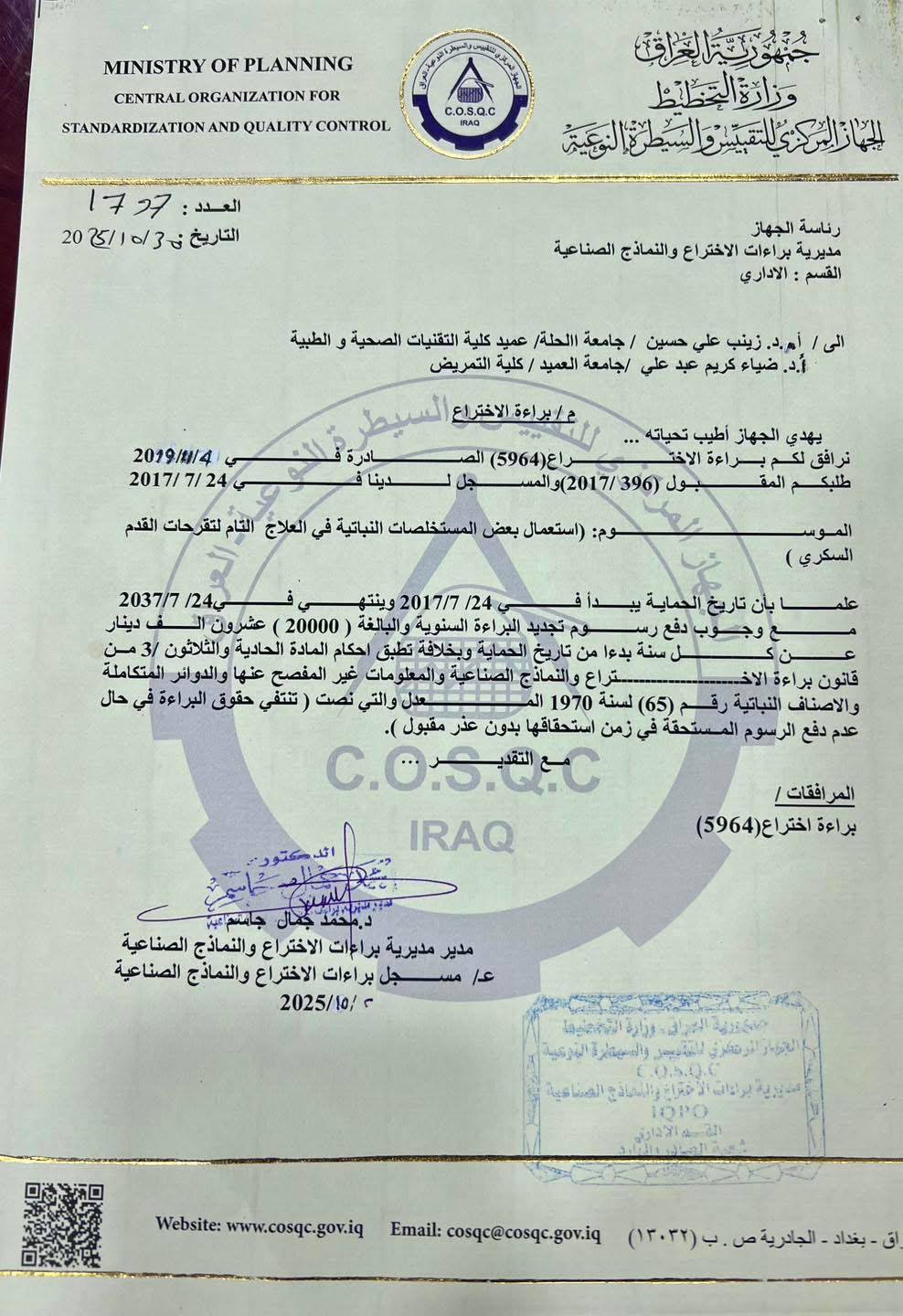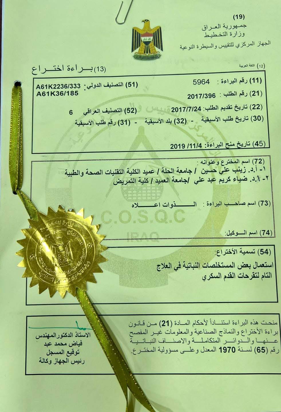 في إنجاز علمي جديد يضاف إلى سجل جامعة الحلة، حصل عميد كلية التقنيات الصحية الطبية الاستاذ الدكتوره زينب علي حسين، على براءة اختراع مرموقة لعلاج تقرحات القدم السكري باستخدام مواد طبية مستخلصة من نباتات طبيعية.