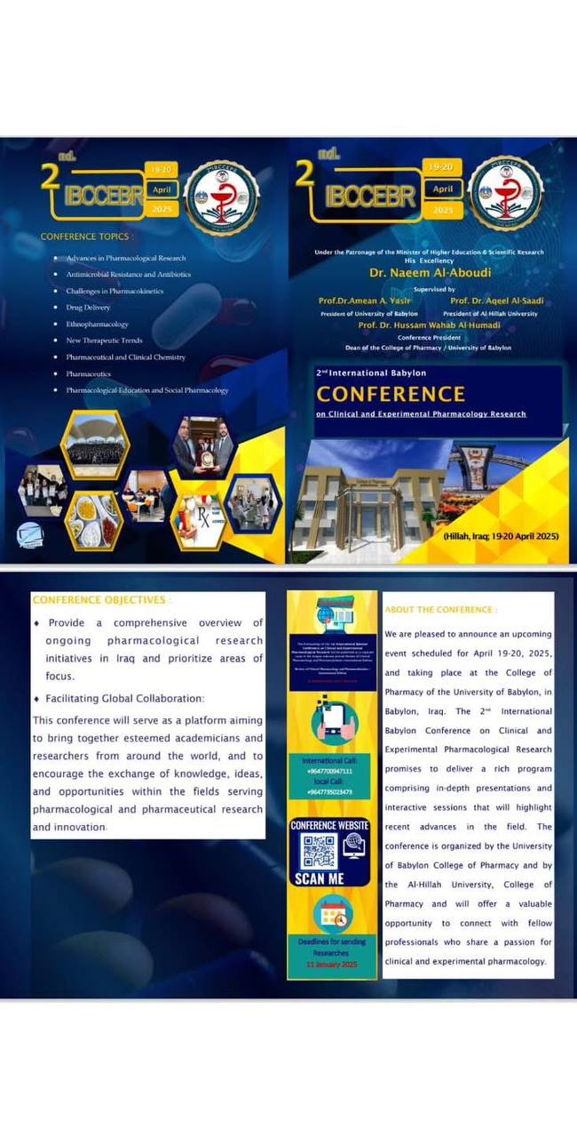 بعد النجاح الكبير الذي حققه مؤتمر بابل الدولي الأول للأبحاث الدوائية السريرية والتجريبية، والذي تم خلاله نشر 50 ورقة بحثية في مجلة عالمية ضمن مستوعبات SCOPUS، وبمشاركة باحثين من 12 دولة عربية وأجنبية، تعلن كلية الصيدلة في جامعة الحلة، بالتعاون مع كلية الصيدلة في جامعة بابل، عن بدء التقديم للمشاركة في مؤتمر بابل الدولي الثاني للأبحاث العلاجية التجريبية والسريرية.