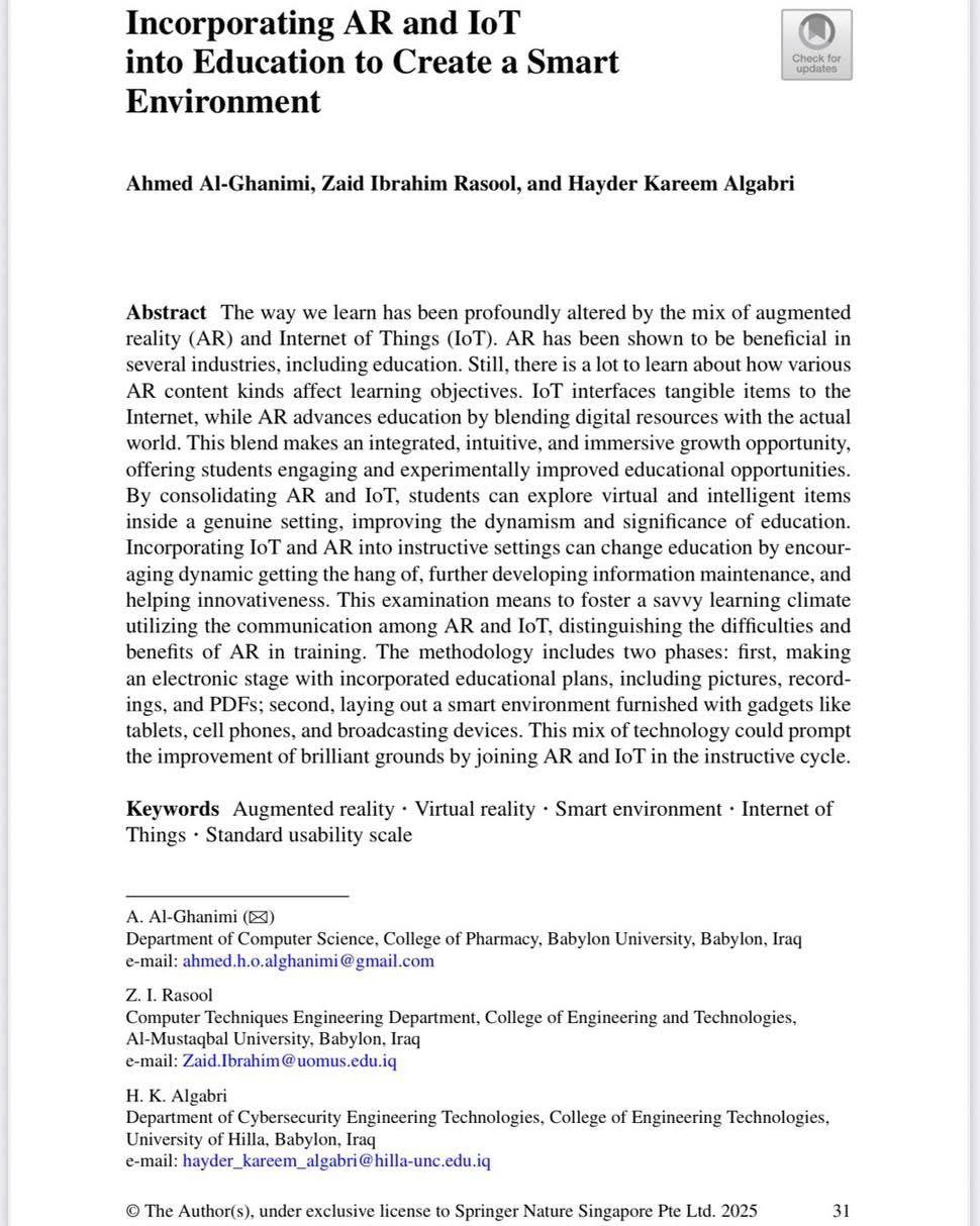 نشر رئيس قسم هندسة تقنيات الأمن السيبراني في كلية التقنيات الهندسية بجامعة الحلة، الدكتور حيدر كريم مظهر، بحثاً علمياً بعنوان: “Incorporating AR and IoT into Education to Create a Smart Environment”