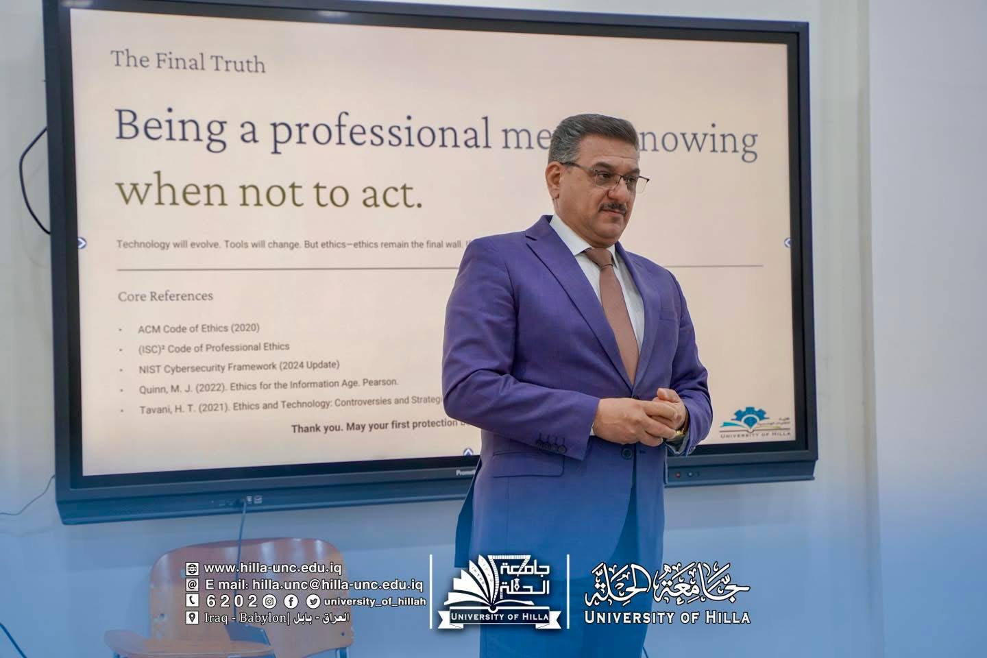 برعاية السيد رئيس جامعة الحلة الأستاذ الدكتور عقيل السعدي، وبإشراف عميد كلية التقنيات الهندسية الأستاذ الدكتور هارون عبد الكاظم، ورئيس قسم هندسة تقنيات الأمن السيبراني المدرس الدكتور حيدر كريم، ومدير مركز التعليم المستمر المدرس الدكتور عدنان عباس الراجحي، أقام قسم هندسة تقنيات الأمن السيبراني ورشة عمل بعنوان (الأمن السيبراني بين الأخلاق والمسؤولية).
