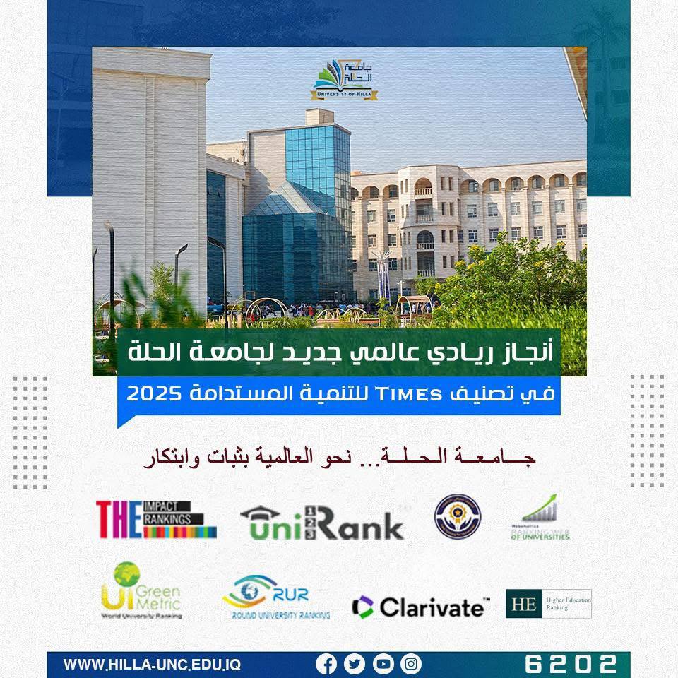 في إنجاز جديد يعكس التميّز الأكاديمي والالتزام الفعّال بأهداف التنمية المستدامة، أحرزت جامعة الحلة مركزًا رياديًا على المستوى العالمي ضمن تصنيف Times Higher Education Impact Rankings 2025، وجاء هذا التميّز ضمن إطار التقدم اللافت للعراق في التصنيفات الدولية، حيث أُدرجت 88 جامعة عراقية ضمن التصنيف لهذا العام، مما منح العراق المركز الخامس عالميًا من حيث عدد الجامعات المصنفة.