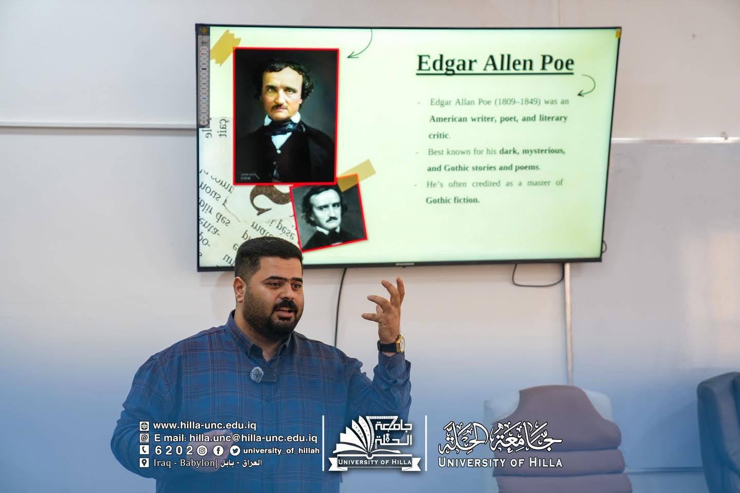 أما الندوة الثانية فجاءت بعنوان “التحليل النفسي في الأدب.. قراءة في قصة The Black Cat”، قدّمها التدريسي م.م. قاسم جواد عبد الكاظم من قسم اللغة الإنكليزية، وتناولت الاتجاه النفسي في النقد الأدبي بوصفه أداة لفهم الصراعات الداخلية للشخصيات الأدبية. استعرضت الندوة تطبيق مفاهيم التحليل النفسي الفرويدي (الهو، والأنا، والأنا الأعلى) على قصة The Black Cat للكاتب الأمريكي إدغار آلان بو، للكشف عن الصراع النفسي وتأثيره في الإبداع الأدبي والسلوك الإنساني.
