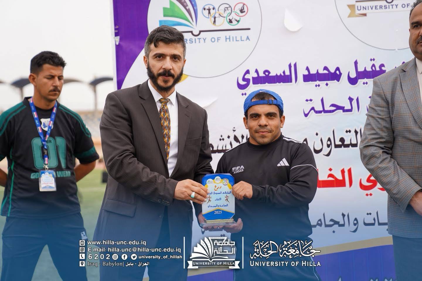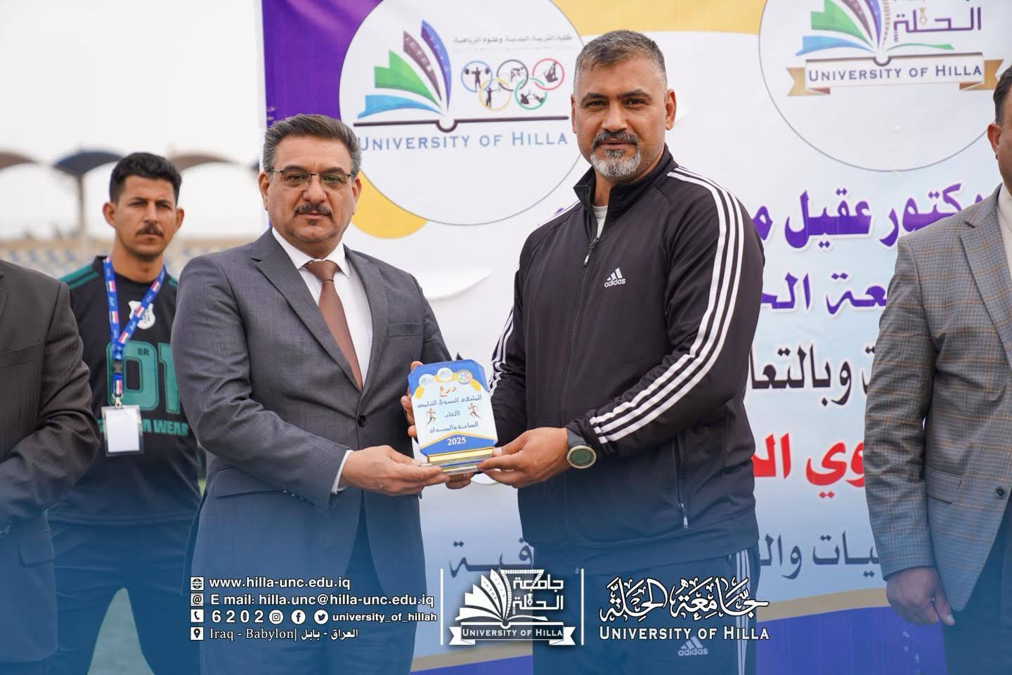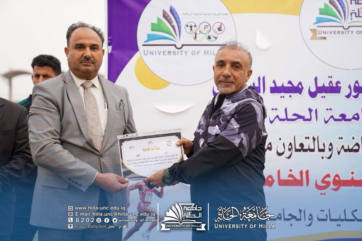 برعاية الأستاذ الدكتور عقيل السعدي رئيس جامعة الحلة، وبإشراف مباشر من عميد كلية التربية البدنية وعلوم الرياضة الدكتور علي الحسناوي، اختُتمت اليوم فعاليات الملتقى السنوي الخامس لألعاب الساحة والميدان الذي نظمته الكلية بالتعاون مع شعبة الأنشطة الطلابية في جامعة الحلة، بمشاركة عشرين جامعة حكومية وأهلية من مختلف محافظات العراق.