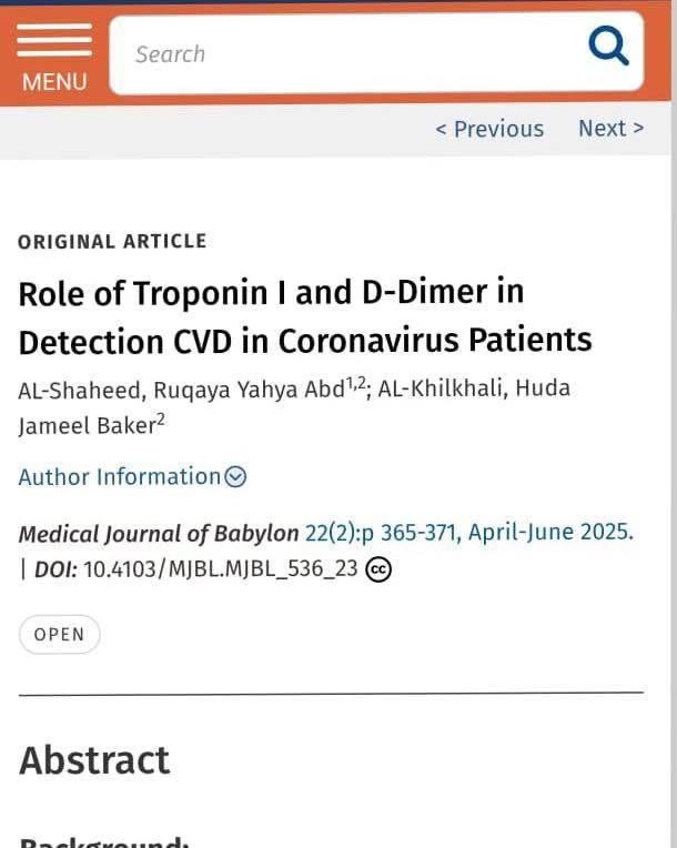 نشر رئيس قسم الأدلة الجنائية في كلية العلوم بجامعة الحلة، المدرس الدكتورة رقية يحيى عبد الشهيد الطفيلي، بحثاً علمياً في مجلة بابل الطبية المصنفة ضمن مستوعبات سكوبس Q2، تناول فيه دور مؤشري Troponin I و D-dimer في الكشف عن أمراض القلب والأوعية الدموية لدى مرضى فيروس كورونا.