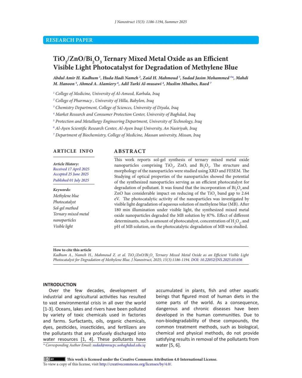 “أكاسيد المعادن الثلاثية المختلطة TiO₂/ZnO/Bi₂O₃ كعامل حفاز فعال بالضوء المرئي لتحلل صبغة الميثيلين الأزرق”،