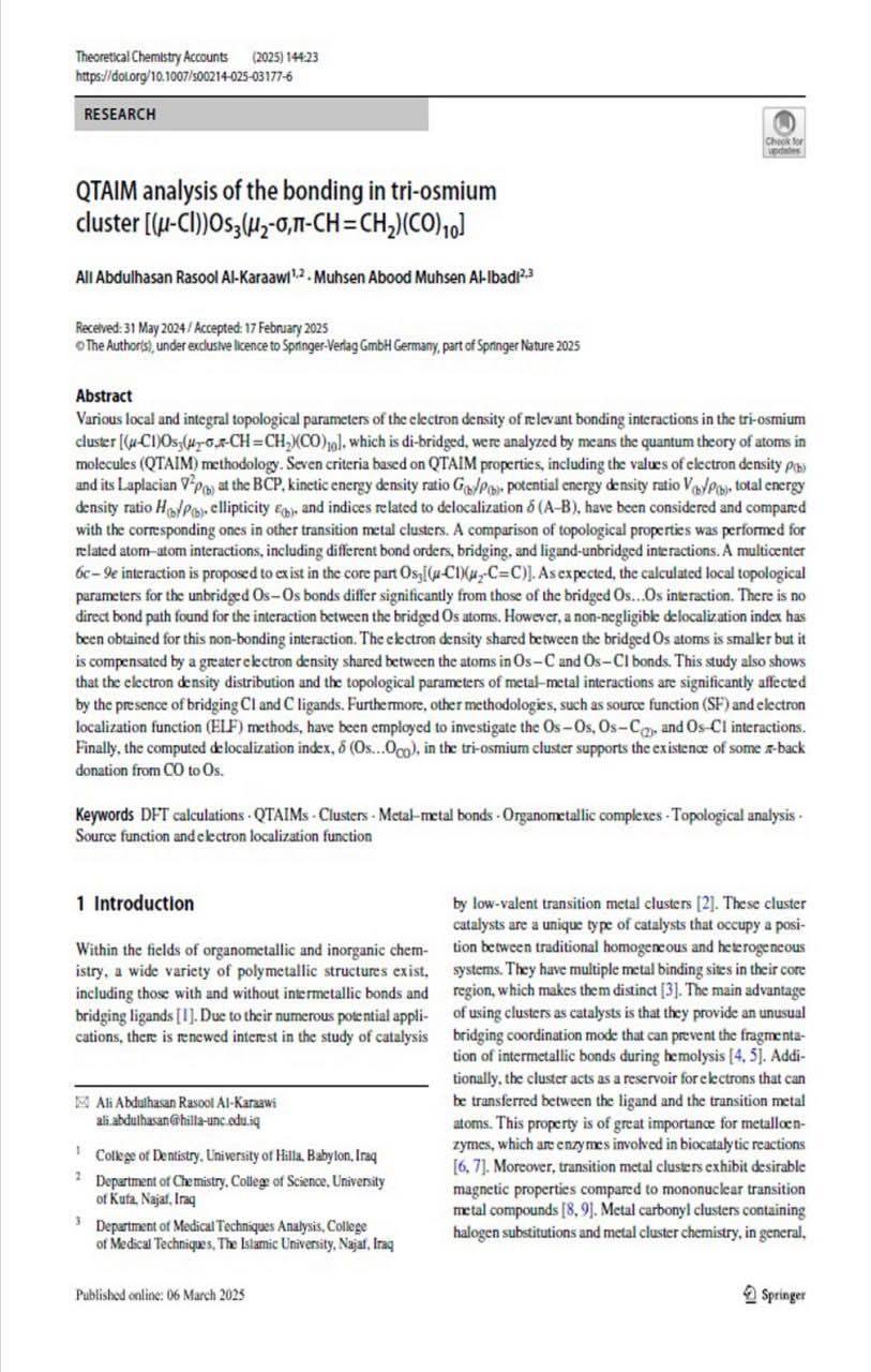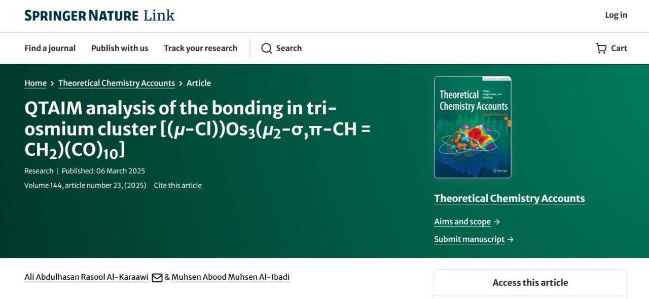 حقق الدكتور علي عبد الحسن رسول، التدريسي في كلية طب الأسنان بجامعة الحلة، إنجازًا أكاديميًا جديدًا بنشره بحثًا علميًا في المجلة العالمية Theoretical Chemistry Accounts، التابعة لدار النشر Springer Nature، والتي تُعد من المجلات العلمية الرصينة ذات التأثير الكبير في الأوساط الأكاديمية.