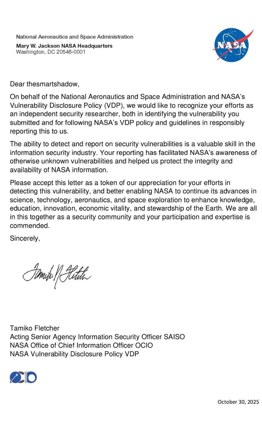 وقد صدر الخطاب من Office of the Chief Information Officer (OCIO) في ناسا، ويحمل توقيع السيدة Tamiko Fletcher بصفتها Senior Agency Information Security Officer (SAISO)، وهي أعلى جهة مسؤولة عن أمن المعلومات في الوكالة.