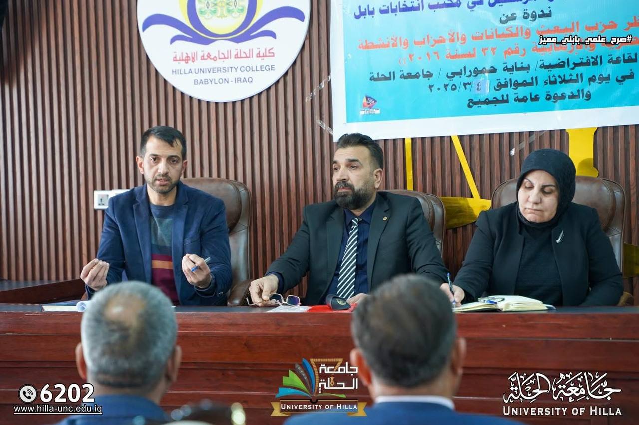 برعاية السيد رئيس جامعة الحلة الاستاذ الدكتور(عقيل السعدي) المحترم، وبالتعاون مع شعبة شؤون الأحزاب والمرشحين في مكتب انتخابات بابل، نظمت كلية القانون ندوة توعوية بعنوان “قانون حظر حزب البعث والكيانات والأحزاب والأنشطة العنصرية والإرهابية رقم 32 لسنة 2016”، وذلك بإشراف السيد عميد كلية القانون (م.د عدنان الراجحي).