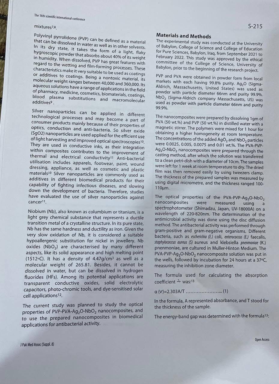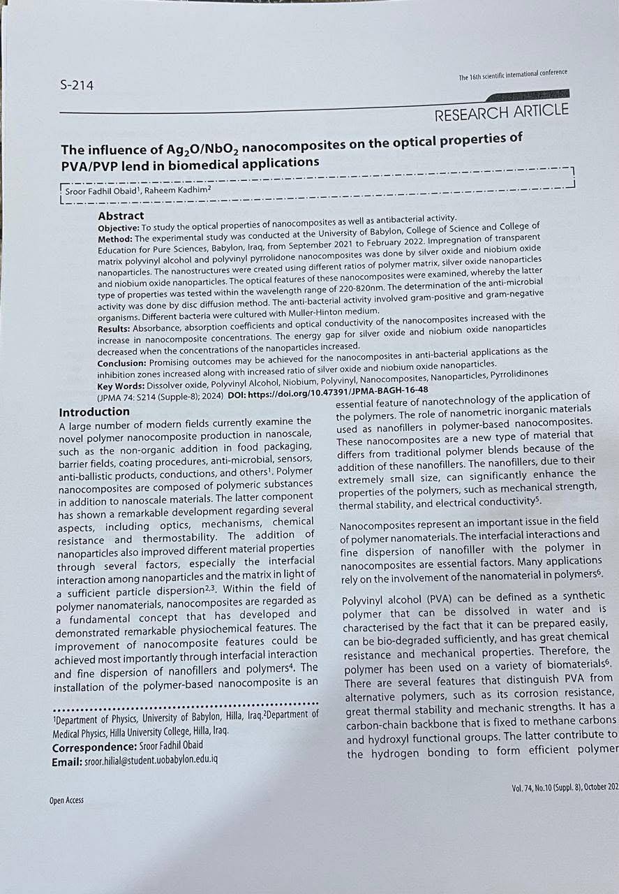 يهدف البحث إلى دراسة الخواص البصرية للمركبات النانوية ونشاطها المضاد للبكتيريا، حيث جرى دمج مركبات نانوية شفافة من بولي فينيل الكحول وبولي فينيل بيروليدون مع جسيمات نانوية من أكسيد الفضة وأكسيد النيوبيوم. وتم تحضير هذه البنى النانوية باستخدام نسب مختلفة من المصفوفة البوليمرية والجسيمات النانوية، وفحص خصائصها البصرية في مدى الأطوال الموجية (220–820 نانومتر).