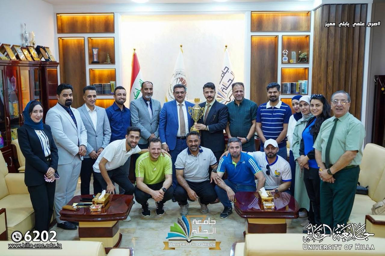 استقبل رئيس جامعة الحلة، الأستاذ الدكتور (عقيل السعدي)، في مكتبه فريق كلية التربية البدنية وعلوم الرياضة، بحضور عميد الكلية الدكتور علي الحسناوي، وذلك بعد تتويج الفريق بالمركز الأول في بطولة جامعات الفرات الأوسط.