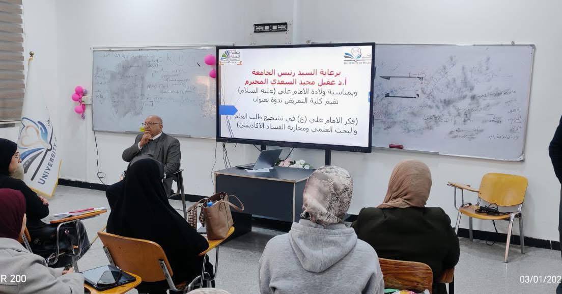 برعاية السيد رئيس جامعة الحلة الأستاذ الدكتور عقيل مجيد السعدي المحترم، وبمناسبة ولادة أمير المؤمنين الإمام علي بن أبي طالب (عليه السلام)، أقامت كلية التمريض ندوة فكرية بعنوان: