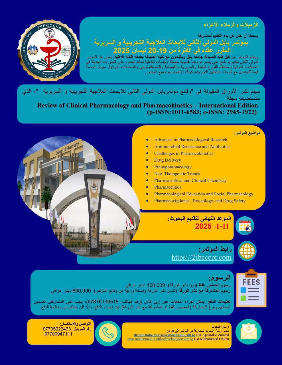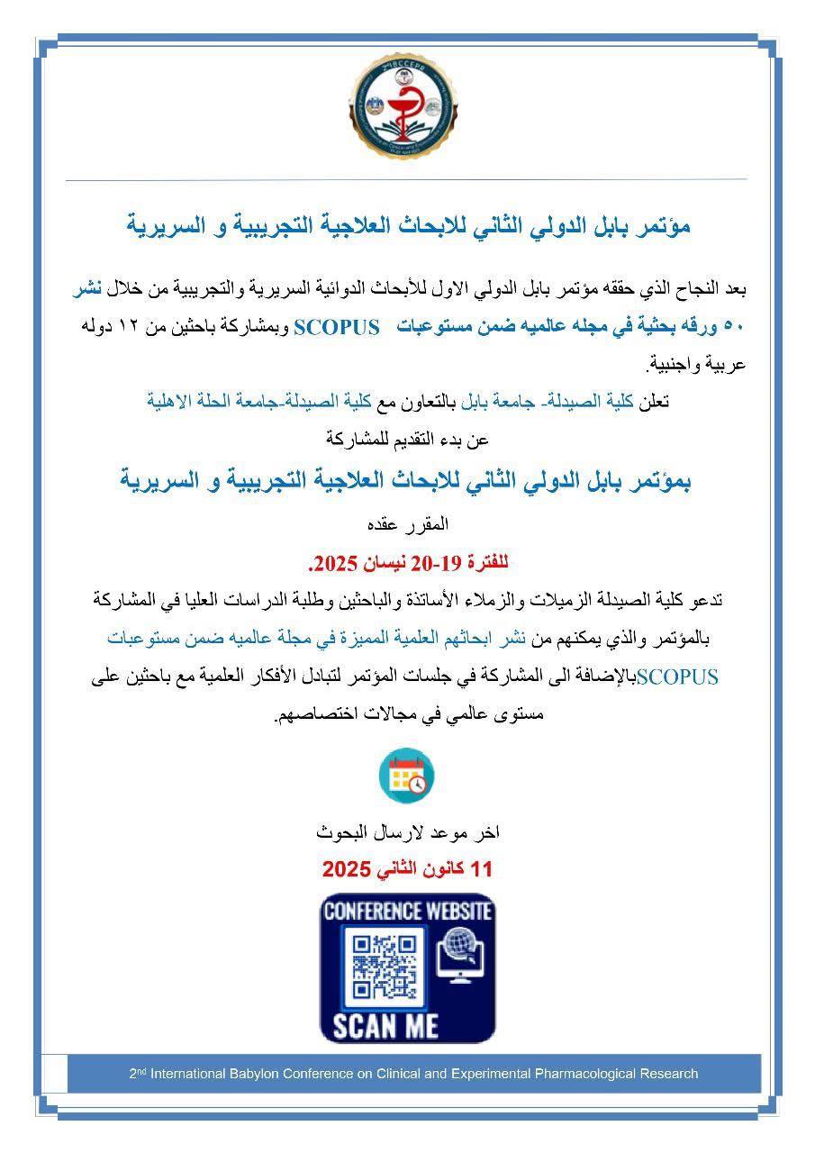 بعد النجاح الكبير الذي حققه مؤتمر بابل الدولي الأول للأبحاث الدوائية السريرية والتجريبية، والذي تم خلاله نشر 50 ورقة بحثية في مجلة عالمية ضمن مستوعبات SCOPUS، وبمشاركة باحثين من 12 دولة عربية وأجنبية، تعلن كلية الصيدلة في جامعة الحلة، بالتعاون مع كلية الصيدلة في جامعة بابل، عن بدء التقديم للمشاركة في مؤتمر بابل الدولي الثاني للأبحاث العلاجية التجريبية والسريرية.