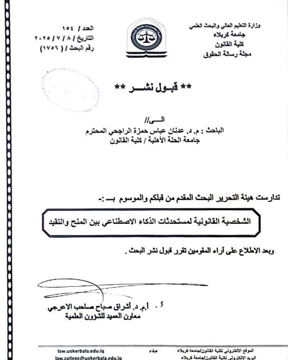 حصل الدكتور عدنان عباس الراجحي، مدير مركز التعليم المستمر، على قبول نشر بحثه الموسوم “الشخصية القانونية لمستحدثات الذكاء الاصطناعي بين المنح والتقييد” في مجلة رسالة الحقوق المحكمة، الصادرة عن جامعة كربلاء والمصنّفة ضمن المجلات العلمية الرصينة في مجال العلوم الإنسانية.