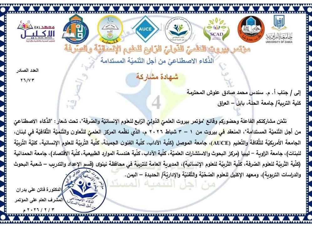 شاركت جامعة الحلة في مؤتمر بيروت العلمي الدولي الرابع للعلوم الإنسانية والصرفة، والذي أُقيم في العاصمة اللبنانية بيروت للفترة من 1 إلى 3 شباط 2026، بمشاركة عدد من الباحثين والأكاديميين من مختلف الجامعات العربية.
