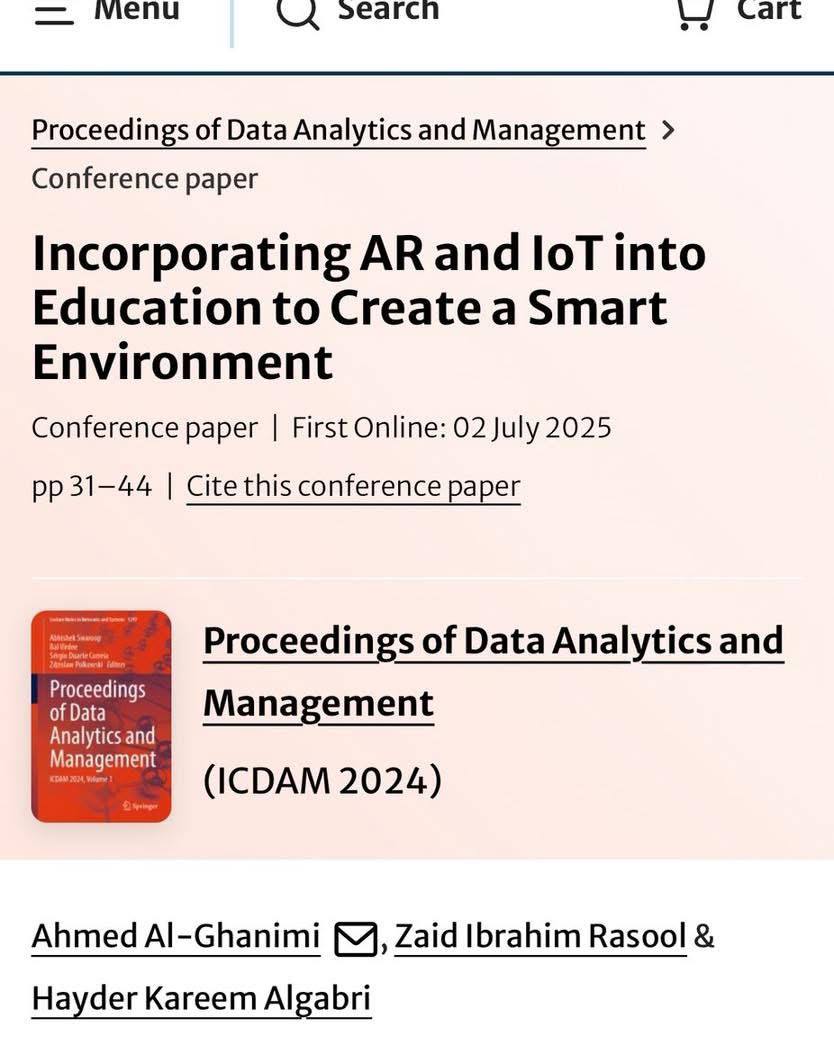 نشر رئيس قسم هندسة تقنيات الأمن السيبراني في كلية التقنيات الهندسية بجامعة الحلة، الدكتور حيدر كريم مظهر، بحثاً علمياً بعنوان: “Incorporating AR and IoT into Education to Create a Smart Environment”