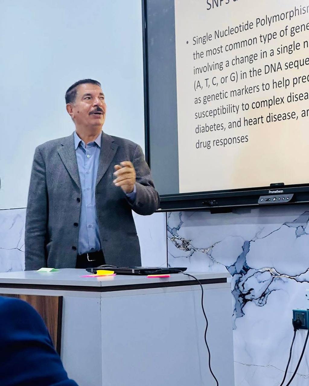 وقدّم الورشة الأستاذ الدكتور زيدان خليف، حيث استعرض خلالها الأسس العلمية لتصميم البوادئ (Primers) المستخدمة في التقنيات الجزيئية للكشف عن الطفرات الجينية المفردة (SNPs)، مبيناً أهميتها في تشخيص الأمراض المختلفة ودورها في تطوير أساليب الفحص الجزيئي الحديثة داخل المختبرات الطبية.