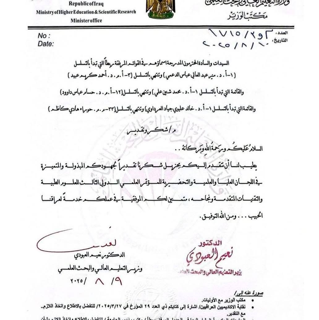 ويأتي هذا التكريم تأكيدًا على الدور الريادي الذي يقدمه الدكتور الياسري في دعم البحث العلمي وتعزيز التعاون الأكاديمي، بما يسهم في الارتقاء بمستوى التعليم الطبي في العراق.