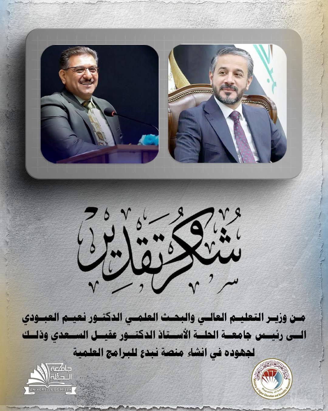 نال رئيس جامعة الحلة الأستاذ الدكتور عقيل مجيد السعدي كتاب شكر وتقدير من معالي وزير التعليم العالي والبحث العلمي الدكتور نعيم العبودي، وذلك تثميناً لجهوده المتميزة في إنشاء منصة “نُبدِع” الخاصة بالبرامج العلمية التي أسهمت في دعم الابتكار وتعزيز التواصل الأكاديمي داخل الجامعات العراقية.